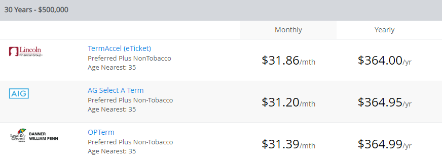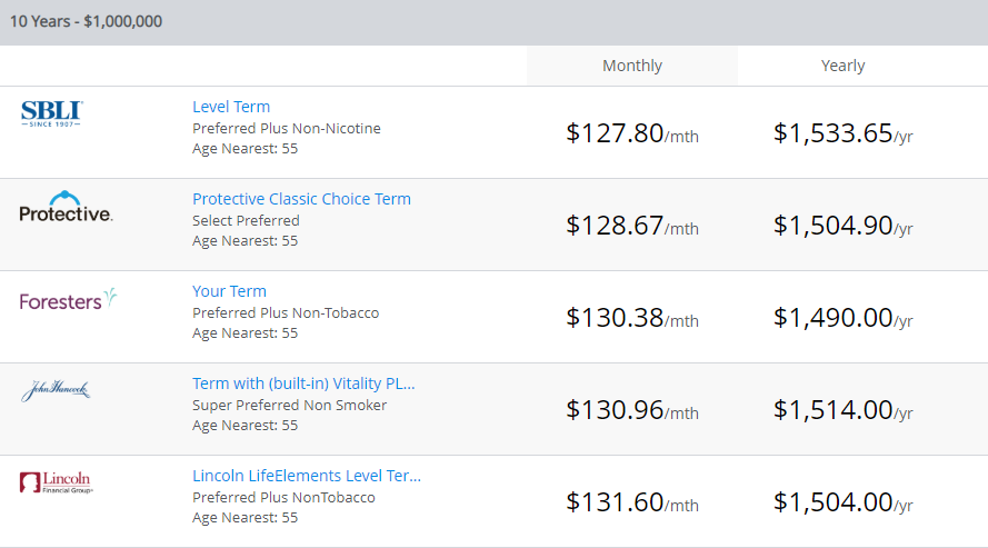 | Level Term | Preferred Plus Non-Nicotine | Age Nearest: 55 | $125.11/mth | $1,501.44/yr |