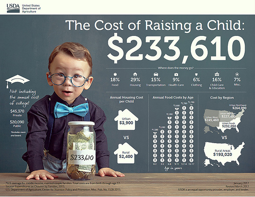 You will probably have to go out and get a job to cover childcare. If you have older children you may have to cover student loans! So, How much on average does it cost to raise a child?