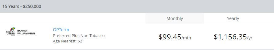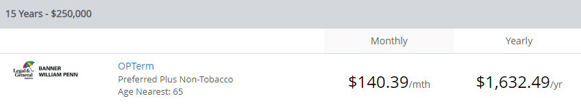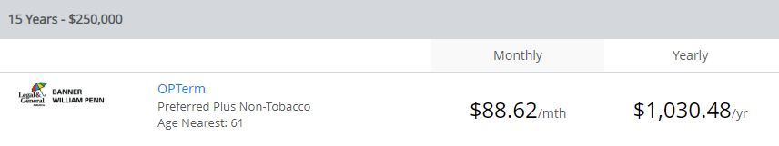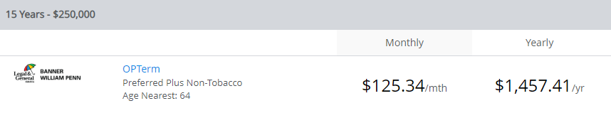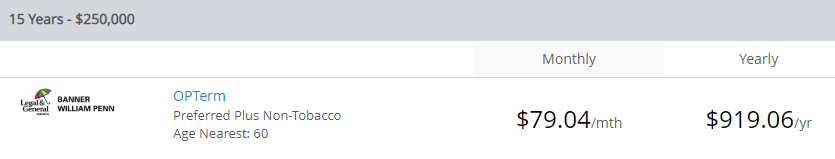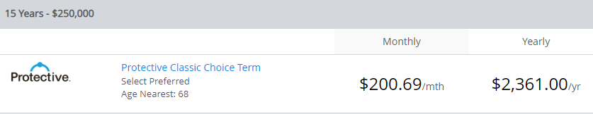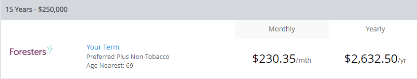 You can clearly see that life insurance quotes for over 60 drastically increases between the age of 60 and 70. AT age 60 the rate for a $250k 15yr term is $79.04/month compared to $230.35/month at age 69.